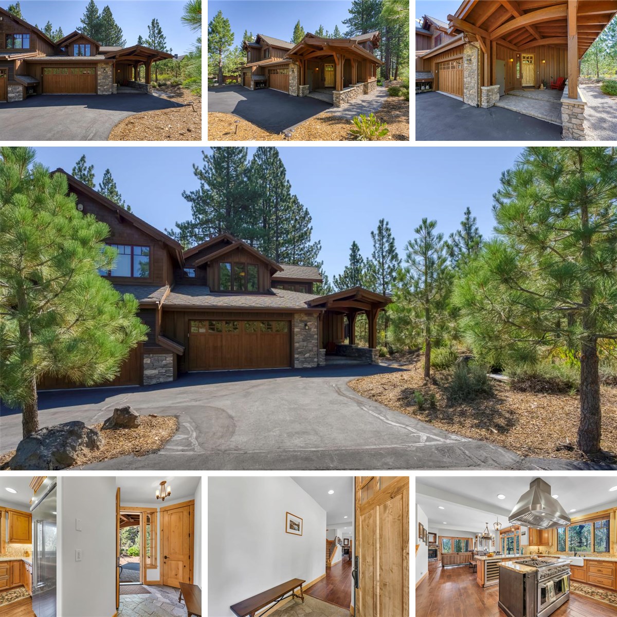 At the heart of the home, a gourmet kitchen with a breakfast bar and generous prep space invites you to create memorable meals. The adjoining great room features a gracious dining area with a raw-edge wood table and a vaulted-ceiling living space anchored by a dramatic mountain-stone fireplace.